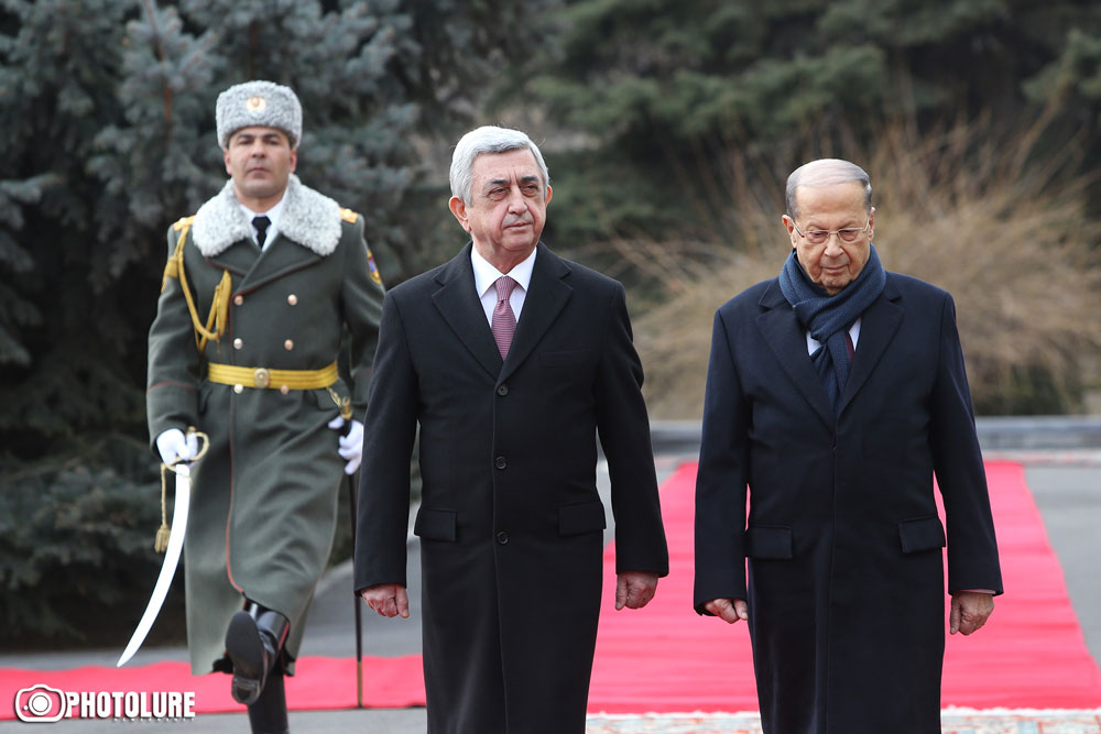 Հայաստանի Հանրապետութեան նախագահ Սերժ Սարգսեան երէկ հիւրընկալեց Լիբանանի նախագահ Միշել Աունը, որ պաշտօնական այցելութիւն մը տուաւ Երեւան։ Նախագահական ապարանքին մէջ Սերժ Սարգսեան զինուորական պաշտօնական արարողութիւնով դիմաւորեց իր պաշտօնակիցը։