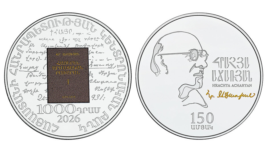 Հայաստանի կեդրոնական դրամատունը վերջին օրերուն շրջանառութեան մէջ դրած է՝ անմահ լեզուաբան Հրաչեայ Աճառեանի ծննդեան 150-ամեայ յոբելեանին ձօնուած արծաթէ յուշադրամ մը։