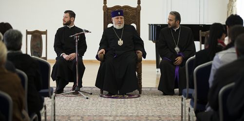 «Վե­հա­փառ Տէր, այ­սօր այս­տեղ հա­ւա­քուած են մար­դիկ, ո­րոնց կեան­քին զգա­լի մէկ ժա­մա­նա­կա­հա­տուա­ծը միա­հիւ­սուած է Մայր Ա­թո­ռի ըն­թաց­քին հետ ու մենք մշտա­պէս կը տես­նենք, որ դուք ինչ­պի­սի ներշն­չան­քով, ան­կոտ­րում կամ­քով ու ան­խոնջ աշ­խա­տան­քով կ՚ուղ­ղոր­դէք մեր Սուրբ Ե­կե­ղե­ցին։ Ձեր նուի­րումն ու ե­ռան­դը մեզ կ՚ո­գեշն­չեն Վե­հա­փառ Տէր, եւ մենք ալ մեր հեր­թին, կը փոր­ձենք թէ­կուզ եւ չնչին կեր­պով նպաս­տել այս ե­կե­ղե­ցա­շէն ու ազ­գա­նուէր գոր­ծին, զոր կ՚ի­րա­կա­նաց­նէք տա­րի­նե­րէ ի վեր։