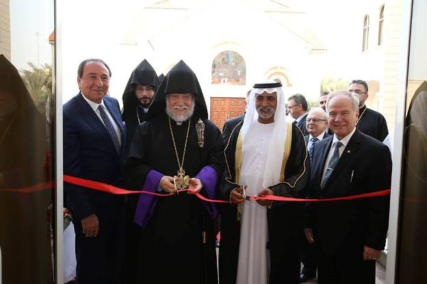 Աւարտին՝ Նորին Սրբութիւնը երախտագիտութեամբ յիշեց հանգուցեալ Շէյխ Զայէտ Պըն Սուլթան Ալ Նահեանը, որ 1998 թուականին խոստումը կատարած էր եկեղեցւոյ եւ անոր համալիրին համար հող տրամադրելու, Շէյխ Խալիֆա Պըն Զայէտ Ալ Նահեանը, որուն օրով տրամադրուեցաւ հողատարածքը, եւ գահաժառանգ Շէյխ Մուհամմէտ Պըն Զայըտ Ալ Նահեանը, հայ համայնքին նկատմամբ իր ցուցաբերած բարեացակամ վերաբերմունքին համար։ Իր խօսքին ընթացքին Նորին Սրբութիւնը բարձրօրէն գնահատեց Արա Խանոյեանը, որուն բարերարութեամբ կառուցուած էր Ապու Տապիի ազգայն վարժարանը եւ Սուրէն Գոճաքեանը՝ որ ստանձնած էր վարժարանի սրահին բարերարութիւնը։ Եզրակացնելով իր խօսքը Արամ Ա. Կաթողիկոս ըսաւ. «Արաբական Միացեալ Էմիրութիւններու Թեմը առաւել ծաղկումի գործընթացին մէջ է։ Դուք, ձեր նուիրեալ ծառայութեամբ ու ներդրումով, անցնող քանի մը տարիներուն, կառուցեցիք նոր եկեղեցի ու առաջնորդարան, եւ անսահման ուրախութիւն է մեզի համար, որ սա պահուն բացումը կը կատարենք մեր նոր վարժարանին, որ գաղութի հայ մանուկներուն եւ պատանիներուն հայեցի դաստիարակութեան կեդրոնը պիտի դառնայ։ Այն գաղութը, որ գմբէթ ու հայկական վարժարան ունի, փայլուն ապագայ եւ գոյատեւելու լուսաւոր հորիզոններ ունի»։