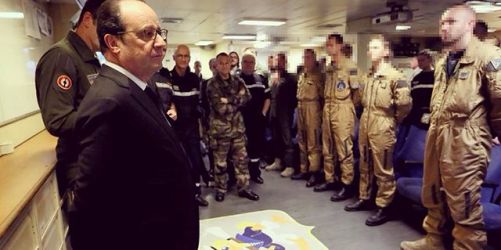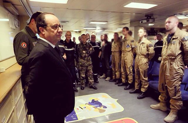 Էլիզէ պալատի աղբիւրները տեղեկացուցին, թէ Ֆրանսուա Օլանտ «Շարլ Տը Կոլ» ռազմանաւուն վրայ տեսակցած է ֆրանսացի զինուորներուն հետ, որոնք կ՚իրականացնեն ԻՇԻՊ-ի դէմ ռմբակոծումները։ Օլանտի պաշտօնական ժամանակացոյցին վրայ այս այցելութեան մասին հաղորդուեցաւ վերջին պահուն՝ հաշուի առնելով անվտանգութեան գործօնները։ Օլանտ մասնակցեցաւ «Շարլ Տը Կոլ»ի հրամանատարութեան կողմէ տրուած պրիֆինկին, զրուցեց գործողութենէն վերադարձած օդաչուներուն եւ թեքնիկ անձնակազմին հետ։ Ան ականատեսը դարձաւ նաեւ ռազմաօդանաւերու առաջադրանքի ուղարկման։ Ֆրանսական բանակի ողնայարի բաղադրիչներէն մին համարկուող այս ռազմանաւուն վրայ ան հանդէս եկաւ նաեւ ելոյթով մը։