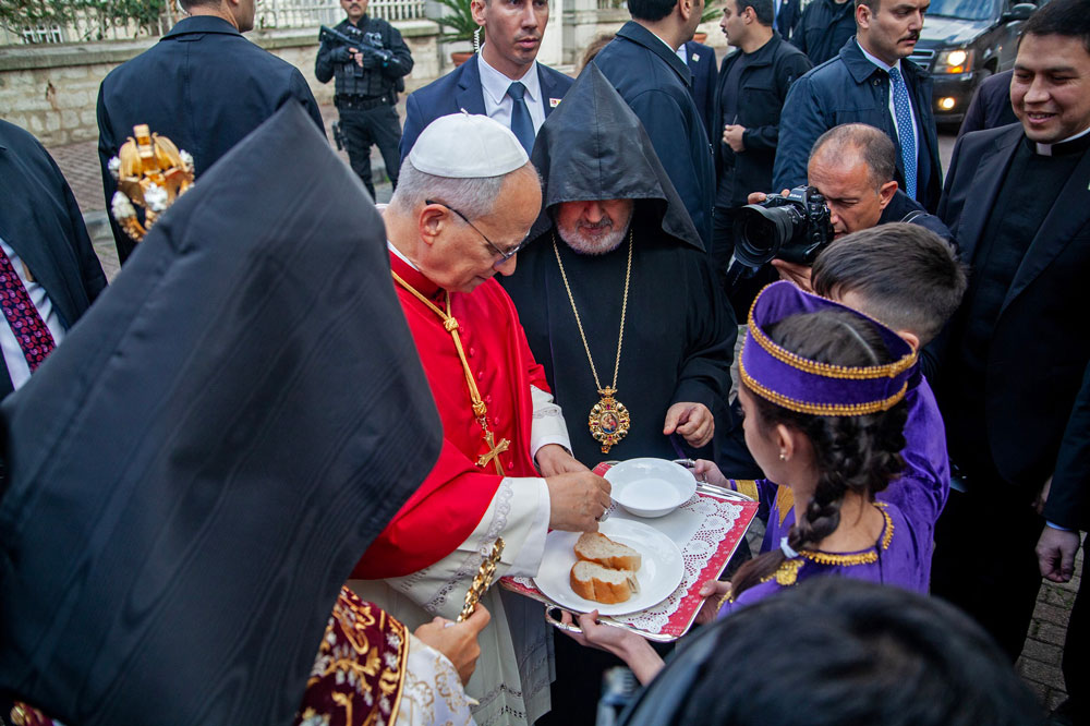 Ամեն. Ս. Պատրիարք Հայրը, որ Սրբազան Քահանայապետի կեցութեան օրերուն միջեկեղեցական ամբողջ ծրագրին ներկայացուցած էր Տ.Տ. Գարեգին Բ. Ամենայն Հայոց Վեհափառ Հայրապետը, երէկ, այս անգամ Աթոռանիստ Մայր եկեղեցւոյ մէջ ընդունեց Սրբազան Պապը եւ իր ողջոյնի խօսքին մէջ ըսաւ. «Ձեր ներկայութիւնը մեր մէջ այսօր ո՛չ միայն պատիւ մըն է, այլեւ օրհնութիւն՝ մեր համայնքին, Թուրքիոյ մէջ գործող եկեղեցիներուն եւ բոլոր անոնց, որոնք քրիստոնեաներու միութեան համար ջանք կը թափեն։ Այս պահը, Ձերդ Սրբութիւն, պիտի մնայ մեր ժողովուրդի սրտերուն մէջ արձանագրուած»։